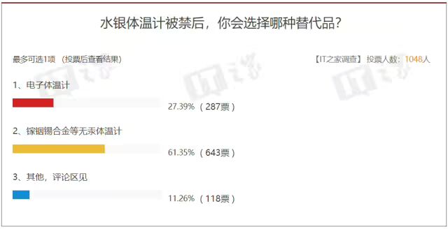 根据IT之家千人投票结果,水银体温计被禁后,超过60%的小伙伴选择购买液态金属的无汞体温计。